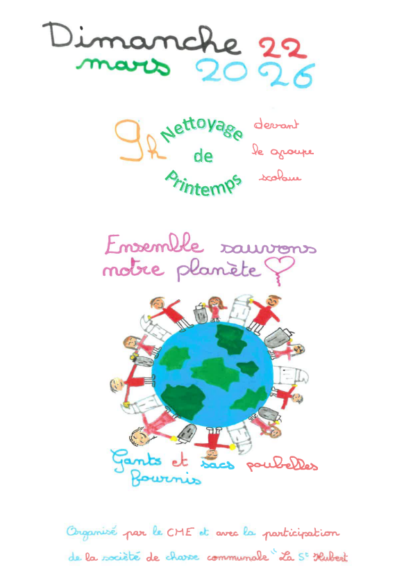 Le Conseil Municipal Enfants (CME) organise, avec la participation de la société de chasse communale "La St Hubert", le grand nettoyage de printemps annuel afin de rendre le village encore plus propre ! rdv le dimanche 22 mars à partir de 9h.