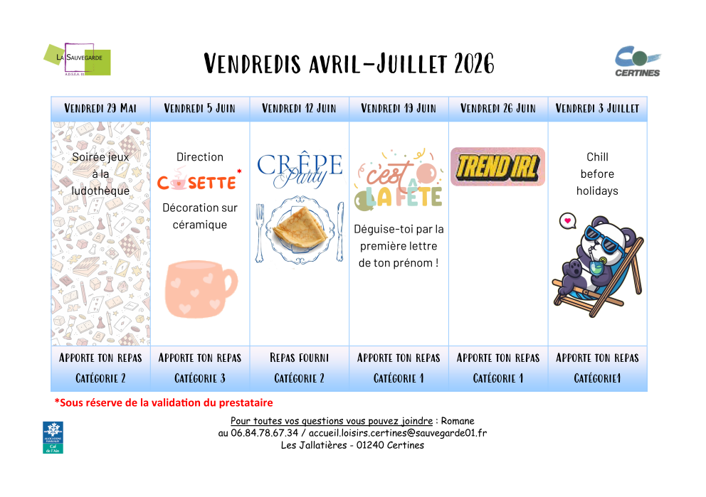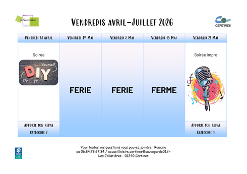 Programme des soirées du vendredi à l'Espace Jeunes Certines d'avril à juillet 2026