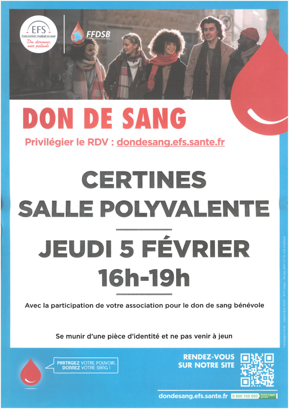 Rendez-vous le jeudi 5 février à la salle polyvalente de Certines entre 16h et 19h pour donner un peu de votre temps et de votre sang !