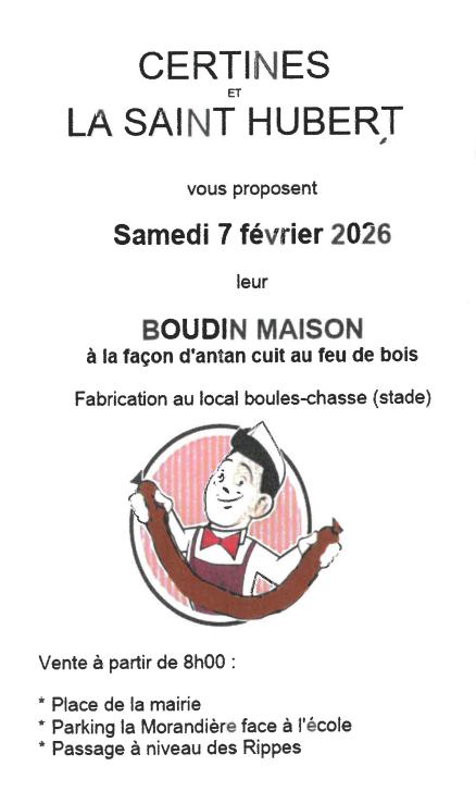 La Saint Hubert à Certines ! vente de boudin maison cuisiné à la façon d'antan et cuit au feu de bois le samedi 7 février.